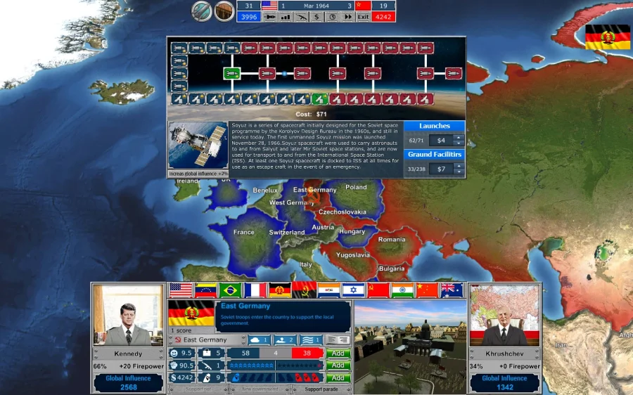 Описание к игре Arms Race – TCWE United Nations: Окей, слушай. Arms Race - The Cold War Era. Не очередная сказка про героизм. Тут всё серьезно! Ты влетаешь прямо в «холодную» заваруху - кто круче, СССР или штаты? Забудь про болтовню и дипломатию - никому тут не интересно. Все решают шпионы, ракеты, подковёрные игры. За тебя целая страна, точнее, супердержава. Можно рулить всем: шпионами, солдатиками, даже экономикой (да, это тоже важно). Четыре десятка лет разборок. Не устанешь? Ну, и отлично! Выбирай сторону, пытайся не облажаться и не проиграть гонку ядерок. Всё выглядит прям аутентично - спецэффекты, карты, звуки. Иногда будто из новостей семидесятых не вылез. Тут реально всё как было: грязные приёмы, внезапные союзы, провокации. Любишь интриги? Прям твоё. Ну и, да, можно попробовать победить историю. Или хотя бы не взорвать всё к чертям. В общем, если хочешь мозгами пошевелить - тебе сюда.
