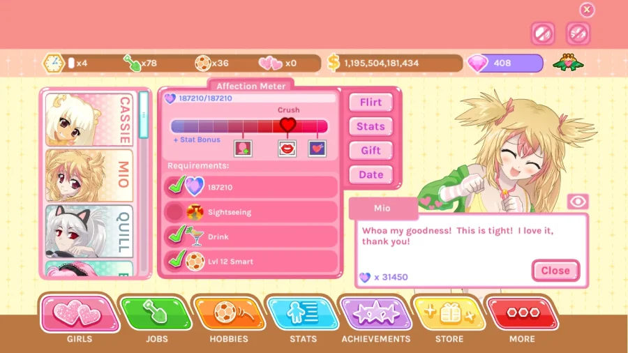 Описание к игре Crush Crush: Окей, поехали! Жанр - симулятор свиданий, но без этих пафосных фраз. Всё просто: в игре Crush Crush ты встречаешь кучу ярких девушек и… ну, пытаешься им понравиться. Порой всё идёт не очень, зато смешно. Тут реально можно облажаться, так что держи ухо востро. Поначалу думаешь, что всё элементарно: подарки, болтовня, свидания. Потом вдруг - бац! - девушка с тараканами в голове и странными мечтами. Придётся подстраиваться, придумывать что-то новенькое. Разные персонажи - разные подходы, скучно не будет. Хочешь прокачать отношения? Старайся! Сидеть без дела тут не вариант. Общайся, подкидывай подарки, следи за реакцией. Бонусы, рейтинги, очки - всё это всплывает со временем. А ещё тебе дадут выбрать, каким будет твой персонаж. Ну и, как водится, работа - деньги сами себя не заработают. Локаций куча. Открываешь их постепенно, каждая - для чего-то нужная. Типа места для свиданий, приколов, сюрпризов. В общем, если хочется похихикать и испытать себя - самое то. Иногда прямо орёшь с происходящего, иногда сидишь и думаешь, как же подкатить посмешнее. Главное - не испортить всё в самом начале. И помнить: вся игра про людей, ну или почти про людей.