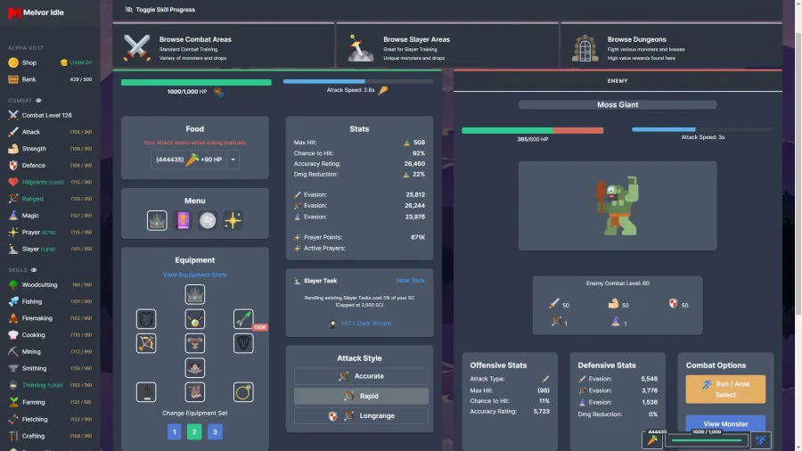 Описание к игре Melvor Idle: Смотри, тут всё просто. Ты попадаешь в Melvor Idle - и становится понятно, тут не до скуки. Ты - главный, вокруг куча врагов. Не просто врагов, а реально бешеных. У всех одна цель - грохнуть тебя. Ну и ты, естественно, не лыком шит. Лезешь в бой, учишься, качаешься. Навыков - тьма, выбирай, что нравится. С каждым новым навыком открывается что-то свежее. Всё, что апгрейдишь, реально влияет на прокачку. Не залипать - тут нельзя. Нужно думать, экспериментировать, пробовать разные фишки. Местами вообще неясно, что за жуть творится. Тайны, сюрпризы, монстры прыгают из-за угла. Надоело махать мечом? Прокачай что-нибудь ещё, разнообразие тут норм. Подбираешь себе оружие, меняешь, улучшаешь. Раздаёшь врагам по полной. Выполнил задание - поймал бонус. Всё чётко: хочешь быть топом - будь готов вкалывать. Здесь реально сложно расслабиться. Но интересно, залипательно и чуть-чуть весело.
